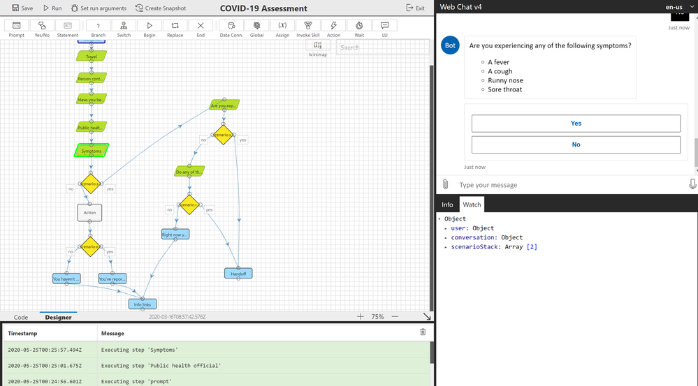 As you answer the series of questions in the chat on the right, you can see that it’s corresponding with the logic on the left hand side. For example, if you click on the “Symptoms” prompt, it’s highlighted in green on the left and reflected in the chat on the right.