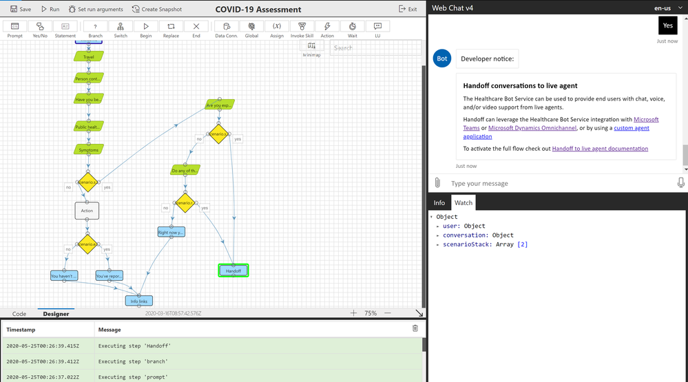 After the questions are answered, the bot classifies patients based on the logic. In this example, if you’re classified as a high-risk patient, the bot reads a Developer Notice, prompting users to configure Handoff conversations to live agent. You can have different end results, such as - a link to virtually schedule an appointment, a connection to a virtual agent, or a link to a virtual physician visit. All of these endpoints can be customized.