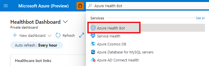 1. Login to https://portal.azure.com and search for “Azure Health Bot”.