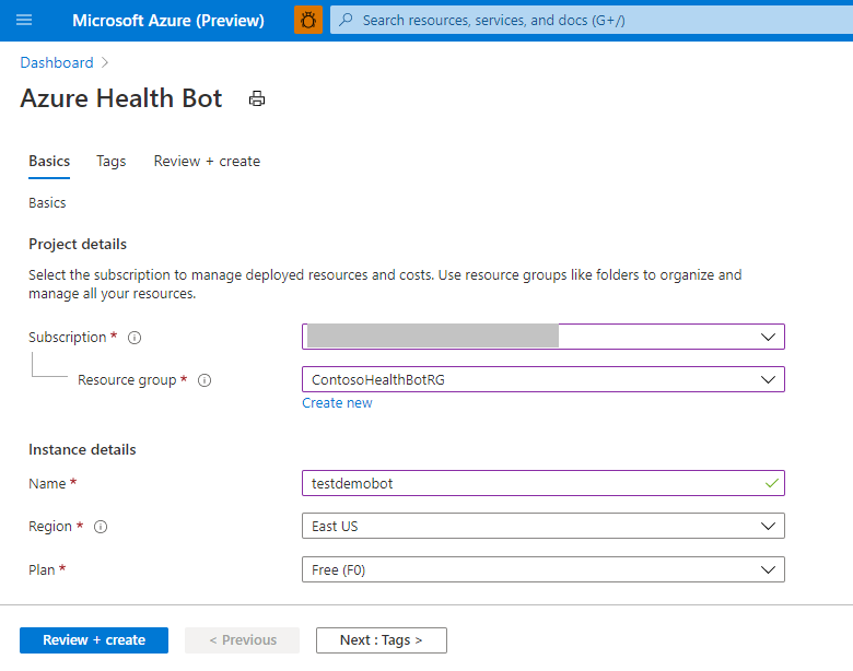 2. Enter the required details and click “Review + Create”. After validation, click "Create". You can start with the Free (F0) plan and update the plan later.