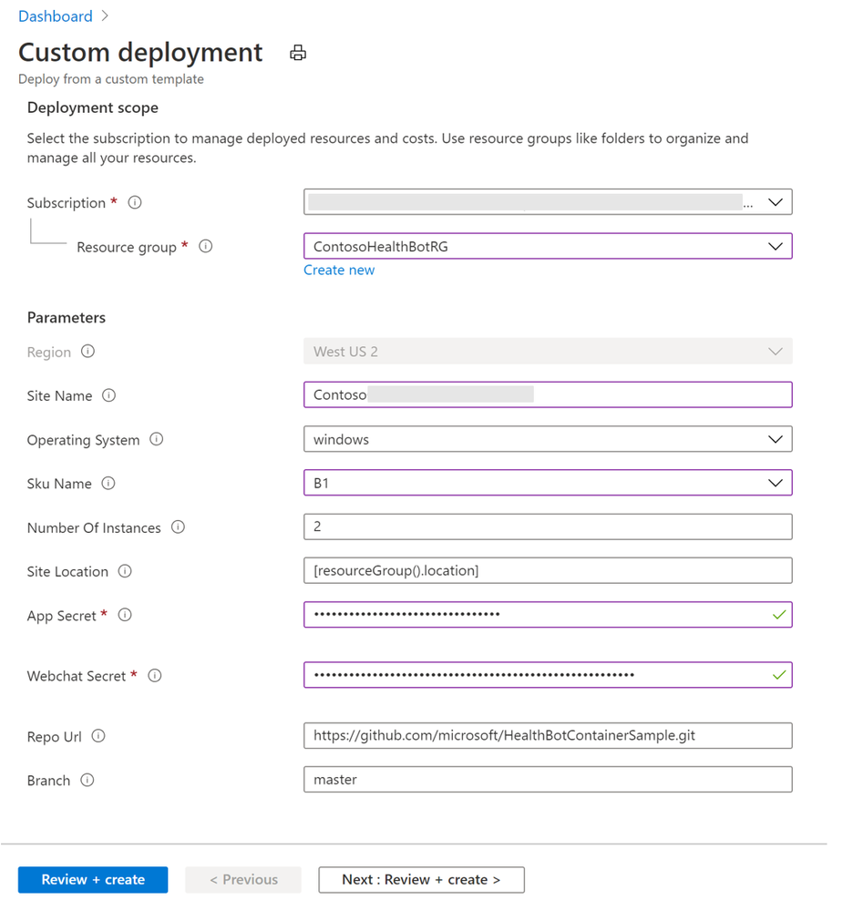 4. You will be redirected to your Azure portal. Sign in using your Azure credentials. Provide necessary details for custom deployment. Use the App Secret and Web chat secret copied in previous step. Click Review + Create. This deploys an app service that will host the health bot.