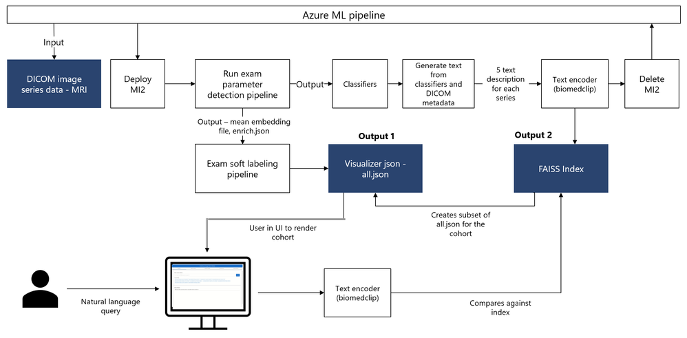 - Image embedding MedImageInsight (MI2): Each image series is passed through the MI2model to generate a numeric image embedding. MI2, trained on multimodal medical images, condenses an image’s visual content (anatomy, modality, etc.) into a vector (e.g. 1024-dimensional). In parallel, a custom exam parameter detection pipeline uses MI2 classifiers to infer properties like orientation (axial/coronal), body region (brain/abdomen), contrast usage, etc., for each series.
