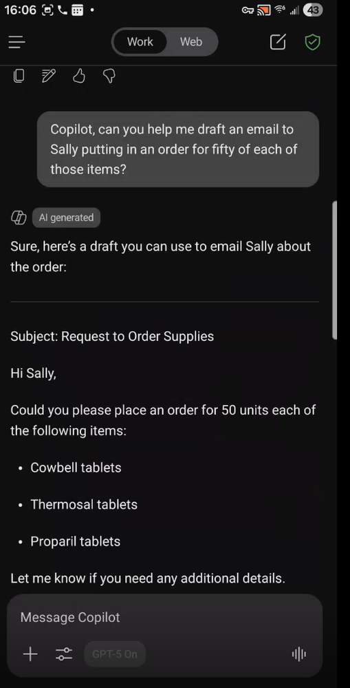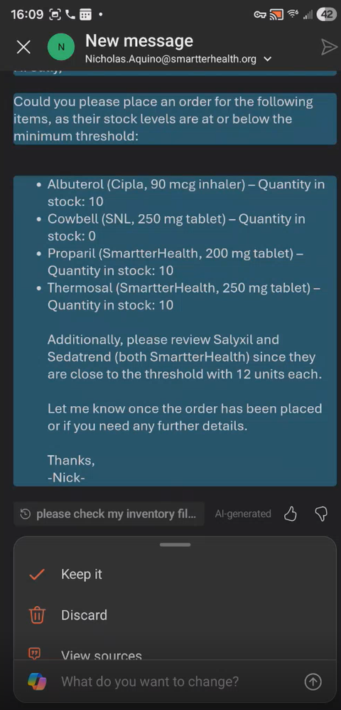 Drafting the reorder email with Outlook Next, the manager says: Copilot creates a professional, accurate email inside Outlook, ready for review—no typing required. This eliminates the friction of switching systems or manually copying inventory items.