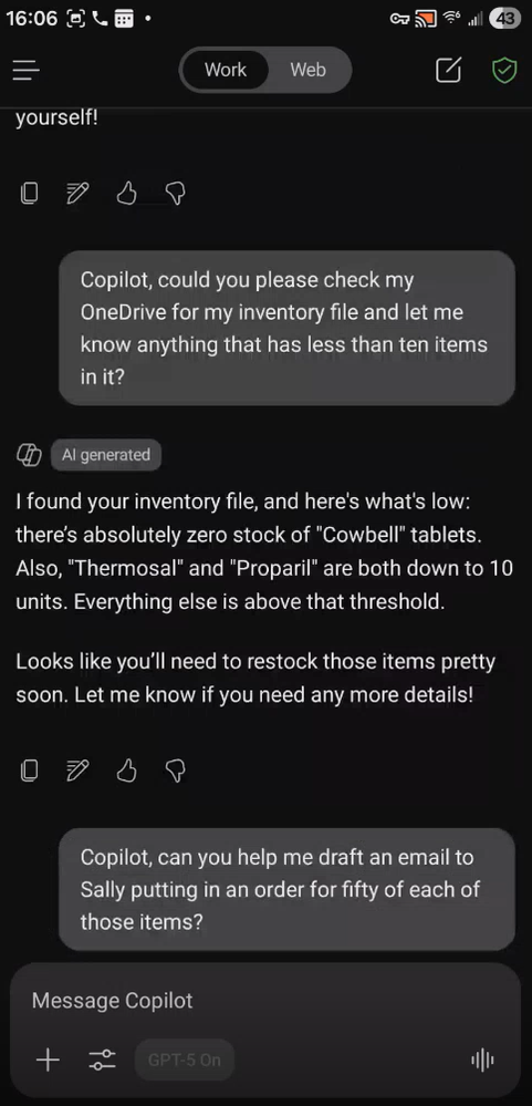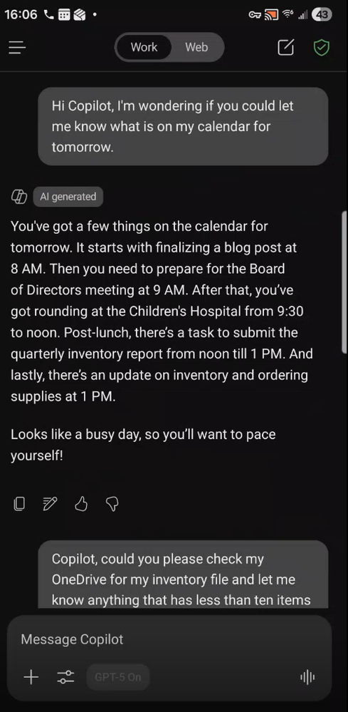 Checking inventory from OneDrive/Excel The manager begins with: “Copilot, could you let me know what’s on my calendar for tomorrow?”
