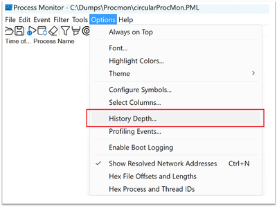 - Under Options > History Depth, you can define how many MB of log data ProcMon should retain before starting to overwrite.