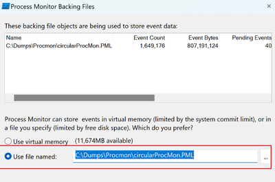 - In the Backing Files dialog box, select Use file named and specify the location and name of the log file (e.g., C:\Logs\procmon.pml).