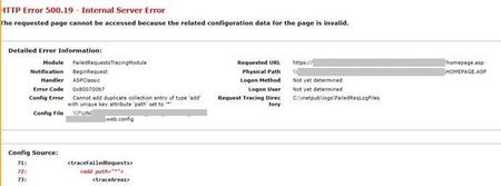 Here is the error message displayed for one of the applications after I enabled Failed Request Tracing in the IIS server: