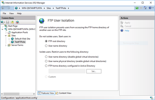 - The user may not be have access to the home directory. Go to “IIS > FTP site > FTP User Isolation”. Select the directory that your users can access. More information about User Isolation settings