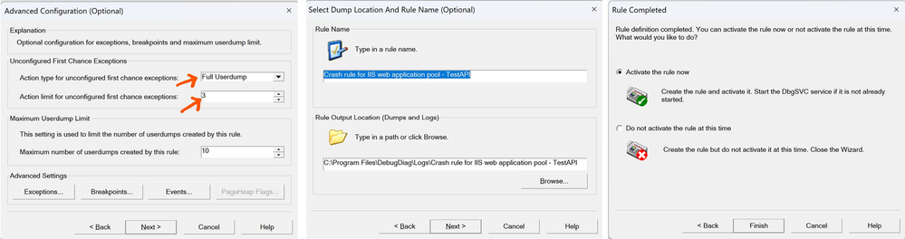 When your application crashes unexpectedly, a memory dump captures the state of the application at the moment of the crash, including active threads, memory usage, and error states. This is useful for diagnosing severe issues that lead to 500 errors. Since the actual error is yet to be identified, you need to capture dumps on first chance exception. Follow the below steps -