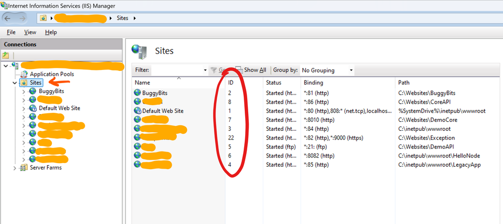To collect the logs, navigate to the log file directory and find the folder name that ends with site number. To know the sites number, Go to Sites from the Connection pane. And look for the ID column. For example, if the site id is 2 then the folder name would be W3SVC2.