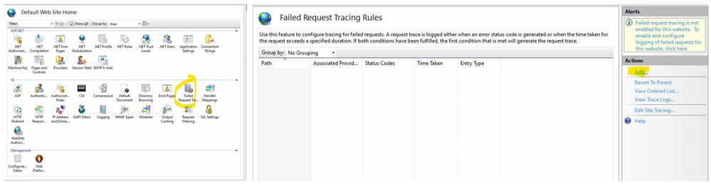 Failed Request Tracing Logs or FREB offer more granular insight than IIS logs by breaking down the request processing pipeline. They track which part of the pipeline causes the failure. Follow the below steps to configure FREB.
