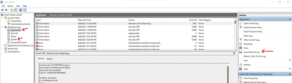 - Export Application and System logs under Windows Logs section by saving all without any filters in .evtx format.