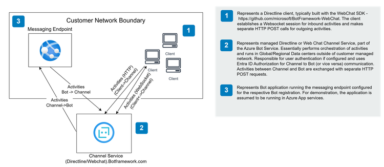 - While achieving full network isolation, your WebApp must handle WebSocket connections and execute functional logic, unlike the public DirectLine where WebSocket connections are managed by Azure Bot Service. (Pricing - Azure Bot Services | Microsoft Azure)