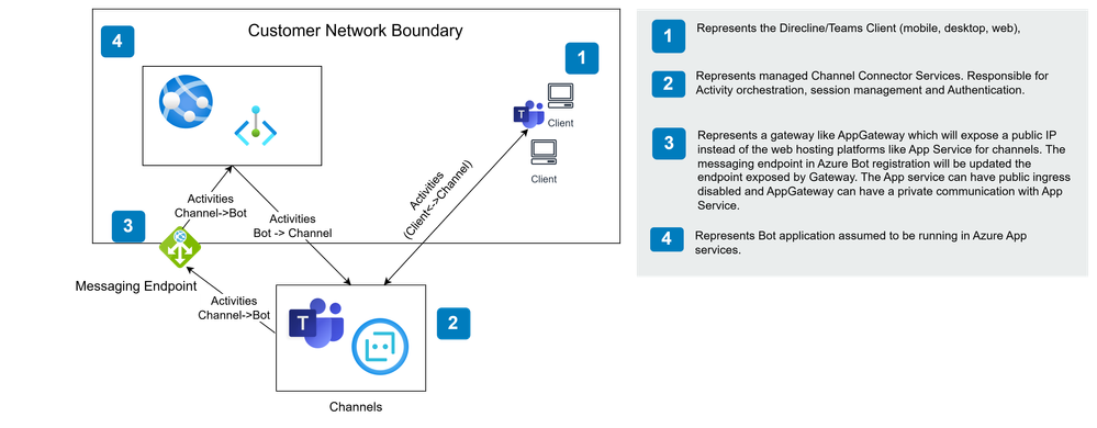 - The messaging endpoint in Bot will be the public endpoint exposed by the gateway. The AppService and AppGW for example can have private communication within Vnet.