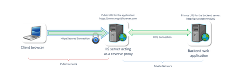 - Rewrite all responses from the backend server, so that any hyperlinks, form action tags and such are constructed with the URL that the IIS reverse proxy server has.