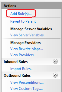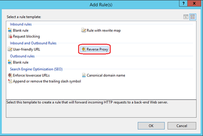 Chose the ‘Add Rule’ action from the right pane of the management console, and the select the ‘Reverse Proxy Rule’ from the ‘Inbound and Outbound Rules’ category.