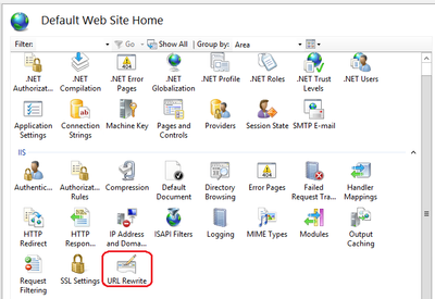 Open the IIS Manager Console and click on the Default Web Site from the tree view on the left. Select the URL Rewrite Icon from the middle pane, and then double click it to load the URL Rewrite interface.