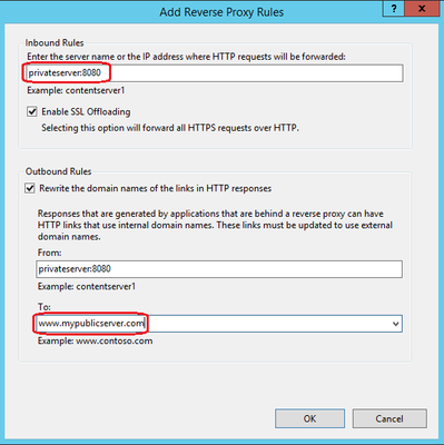 While still in the same configuration window, we also need to provide information to take care of the responses that will be emitted by the backend server and will transit the IIS server on their way back to the requesting browser. These responses may have absolute hyperlinks inside and other information which contains the hostname of the backend server. If these are sent to the browser as is, the end user will not be able to access the resources these links point to simply because the browser does not know where http://privateserver:8080/HomePage.aspx is located and how it can be reached. We need to convert these into the hostname of the reverse proxy server, and have them look like: https://www.mypublicserver.com/HomePage.aspx. For this reason, we will check the ‘Rewrite the domain names of the links in HTTP responses’ checkbox in the Outbound Rules section.