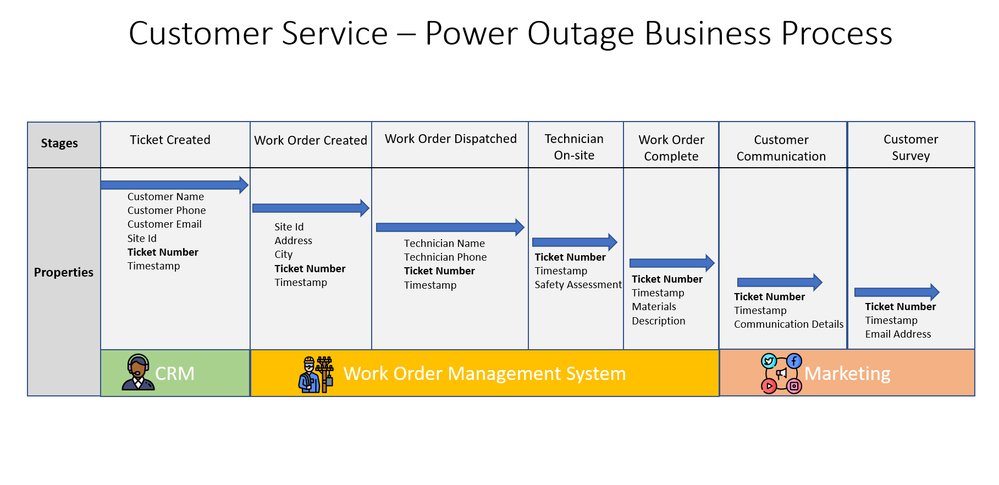 To illustrate how we can use Business Process Tracking, let’s consider a use case from the utilities industry that involves a customer service power outage business process. In this case, our utility named City Power & Light needs to track the status of their power outage process as it moves across 3 different systems.