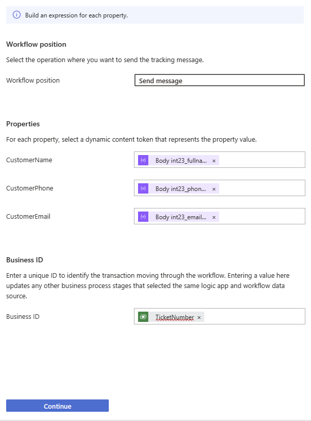 - We now need to provide a mapping between our business process properties and where that data can be found in our workflow. We can take advantage of our workflow designer token picker to search for the relevant data and then select it.