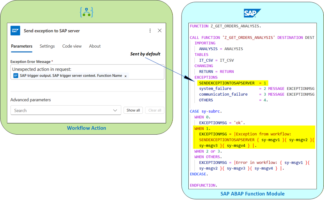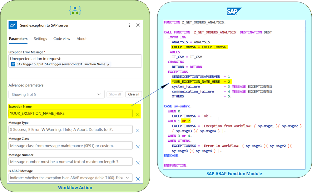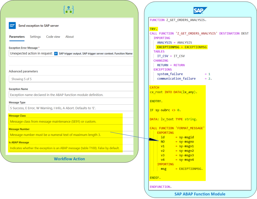 In the message class–based exception configuration, the workflow can provide message metadata (class/number/type) so that SAP can behave “natively”: ABAP receives a failure (sy-subrc <> 0), formats the message using FORMAT_MESSAGE, and returns the final text in a field like EXCEPTIONMSG (and/or in BAPIRET2-MESSAGE). The result is: