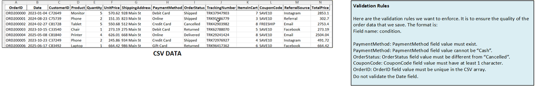 For illustration, I’m using fictitious retail data. The content is made up, but the mechanics are generic: the same approach works for orders, inventory, pricing, master data feeds, or any “file in → decision out” integration. You’ll see sample inputs and outputs below to keep the transformations concrete.