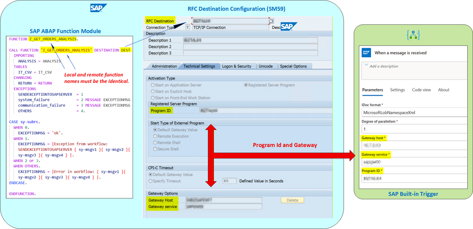 The key takeaway is that both patterns hinge on the same contract: Program ID plus the SAP Gateway host/service. In SAP, those live in SM59 (TCP/IP destination, registered server program). In Logic Apps, the SAP built-in trigger listens using the same Program ID and gateway settings, while the trigger configuration (for example, IDoc format and degree of parallelism) controls how messages are interpreted and processed. Once these values line up, the rest of the implementation becomes “normal workflow engineering”: validation, predictable error propagation, and response shaping.