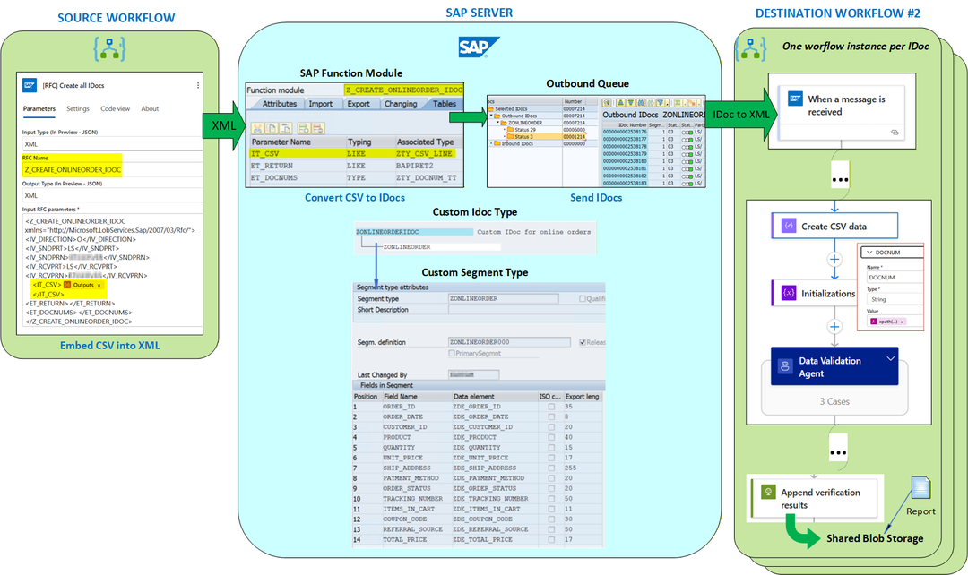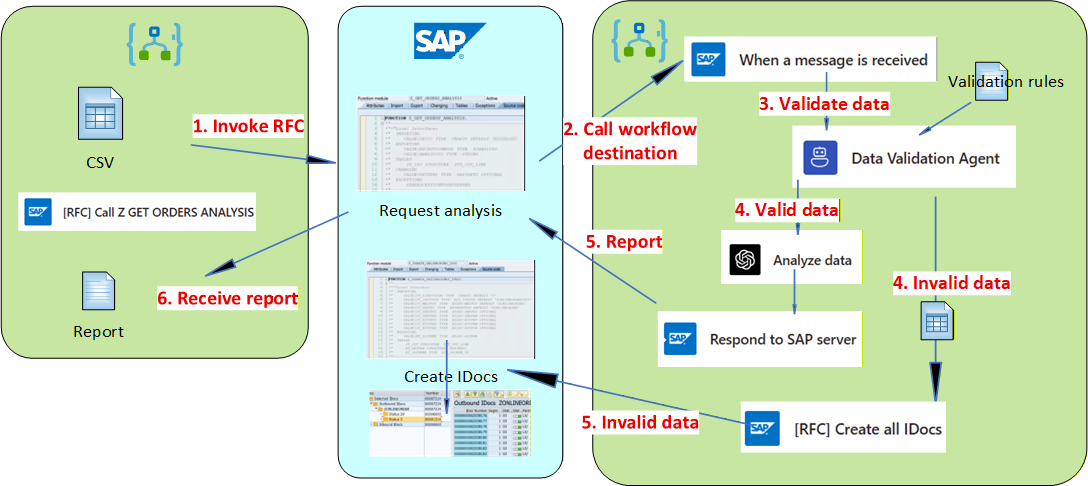 This two-part series presents an end-to-end Azure Logic Apps implementation that integrates the SAP built-in connector with an AI-assisted validation and analysis pipeline. The intent is twofold: (1) complement existing SAP connector documentation by showing the SAP configuration and contracts in real integration context, and (2) move beyond basic connectivity by using AI to produce more actionable results from the same data flow. In the scenario, a Logic App sends CSV documents to an SAP system and receives back a structured analysis document (market trends, predictions, and recommendations) computed only from data that passes pre-defined business rules. Data is exchanged between SAP and Logic Apps using SAP RFCs, with results and failures returned to SAP in a consistent shape and summarized to end users via email. Part 1 focuses on the SAP ↔ Logic Apps integration mechanics—how data moves and how errors propagate. Part 2 covers the AI layer—how validation is performed using an agent loop and how insights are generated through an OpenAI-backed API connection. The approach is intentionally generic and reusable and serves as a starter pattern for new implementations or migrations from platforms such as BizTalk.