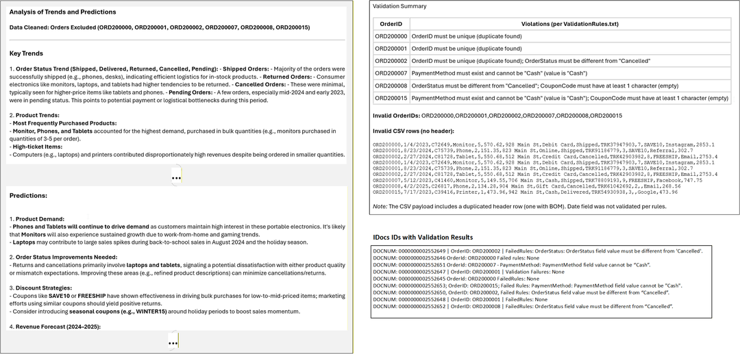Figure: End‑to‑end sender pipelineTwo design choices are doing most of the work here. First, the workflow keeps the CSV transport contract stable by sending the file as a verbatim list of lines—including the header—wrapped into … elements under IT_CSV. Second, it treats the RFC response as the source of truth: EXCEPTIONMSG and RETURN/MESSAGE drive a single Has errors gate, which determines whether the email contains the analysis or a consolidated failure summary.