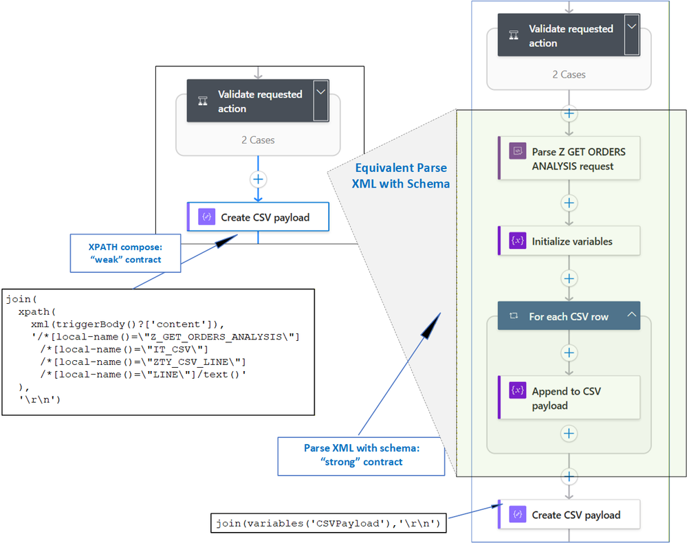 The figure below compares two equivalent ways to build the CSV payload from the RFC input. On the left is the direct xpath() compose (labeled “weak contract”). On the right is the schema-based approach (labeled “strong contract”), where the workflow parses the request first and then builds the CSV payload by iterating over typed rows.