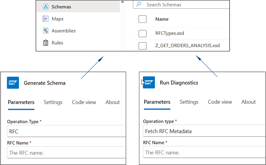 - Generate Schema (SAP connector): a “Generate Schema” action with Operation Type = RFC and an RFC Name field, which is a practical way to bootstrap schema artifacts when you already know the RFC you’re calling.