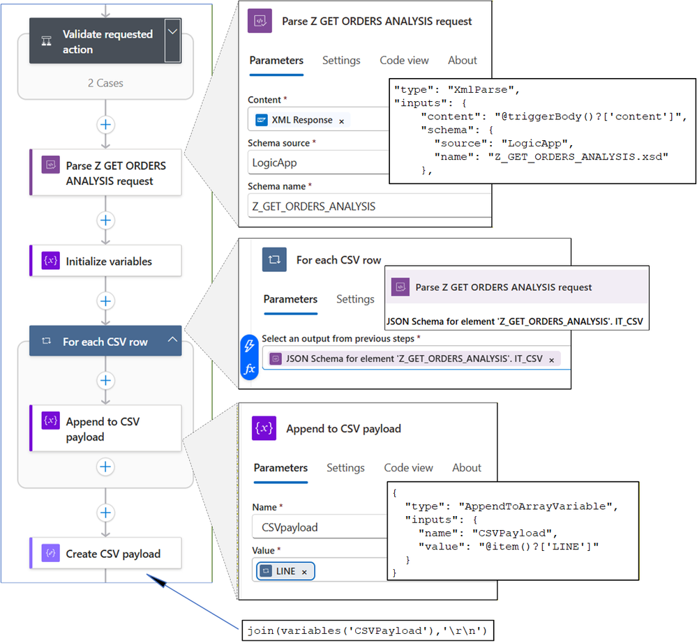 Parse Z GET ORDERS ANALYSIS request”), initializes variables, loops For each CSV row, and Appends to CSV payload, then performsjoin(variables('CSVPayload'), '\r\n'). Here, the contract is explicit—your XSD defines what IT_CSV and LINE mean, and downstream steps bind to those fields rather than re-parsing XML.