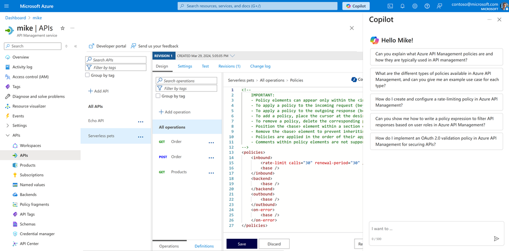 Earlier today, we announced the general availability of Microsoft Copilot in Azure. We're excited to share that authoring Azure API Management policies with Microsoft Copilot in Azure is also generally available, featuring localization, responsible AI, and enhancements to availability, performance, and capabilities.