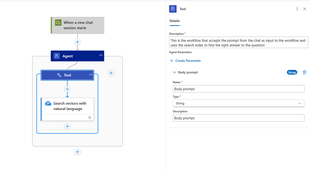 - Agent parameter: Body prompt to pass in context from the chat prompt to the tool