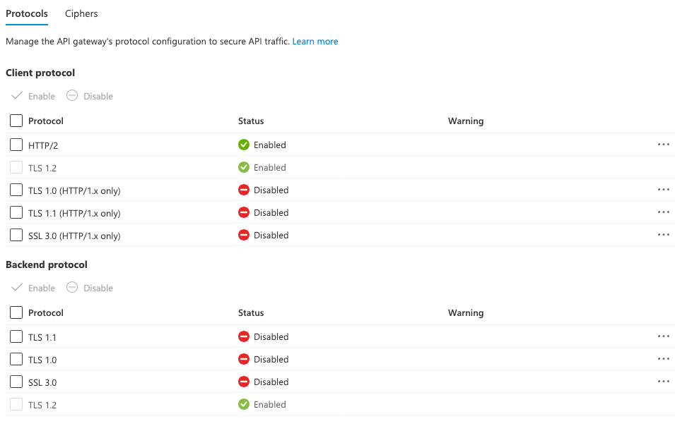The upcoming TLS 1.3 support will provide additional TLS cipher suites supported on Azure API Management. This means there will be a newer set of TLS cipher suites added to the minimum TLS cipher suite feature. Like minimum TLS version, we do not recommend setting minimum TLS cipher suites to a TLS 1.3 cipher suite for your incoming requests before January 2024. There is a risk that this configuration can cause connection failures to your web app, or for incoming requests to be denied if TLS 1.3 was intermittently disabled for your web app.