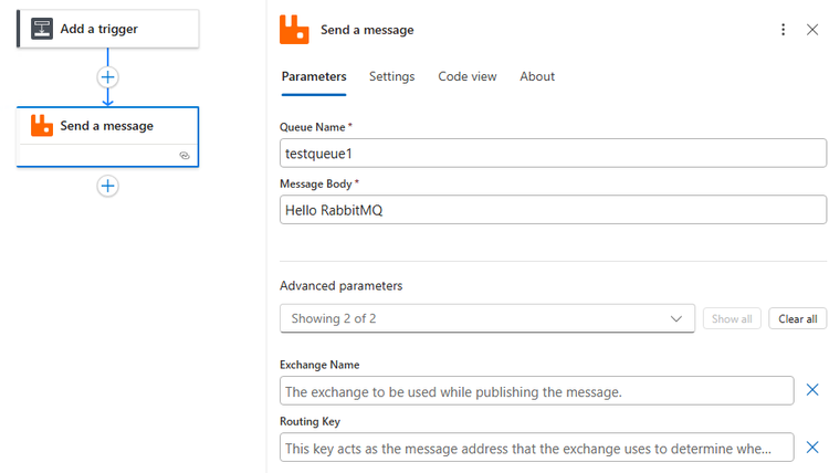 To send a message, search for the RabbitMQ connector in your design experience. You’ll find an operation called Send a message.