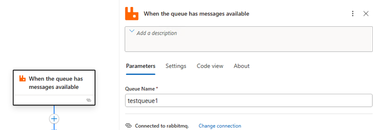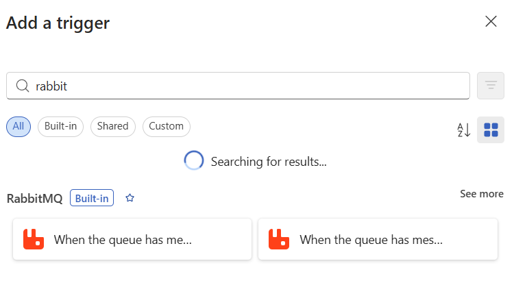 To enable a trigger, we need to search for the RabbitMQ connector within our designer. We will discover an operation called When the queue has messages from RabbitMQ show up as a built-in connector. We also have a peek lock operation for non-destructive reads.