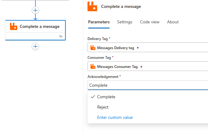 To Complete messages, in scenarios using peek-lock, search for the RabbitMQ connector within the Logic Apps designer. You’ll find an operation called Complete message as a built-in connector. Search for the action and click on this operation to add the action to your design surface.