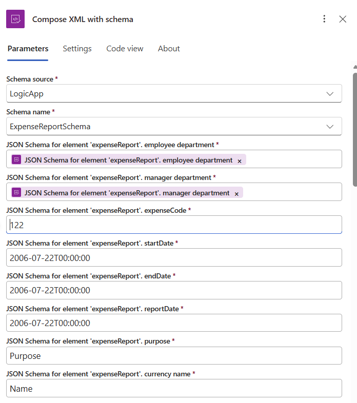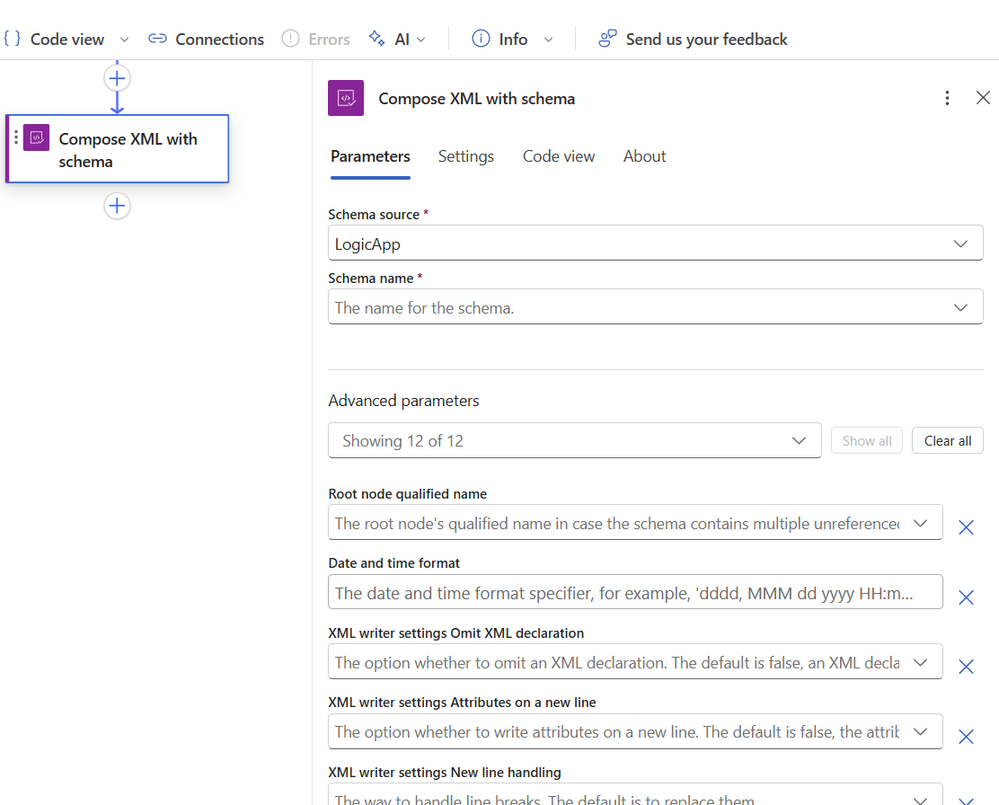 The XML compose with schema allows customers to generate XML data, using an XSD file. XSD files need to be uploaded to the Logic App schemas artifacts or an Integration account. Once they have been uploaded, you should select the XSD file along with entering the JSON root element or elements of your input XML schema. The JSON input elements will be dynamically generated based on the selected XML schema.