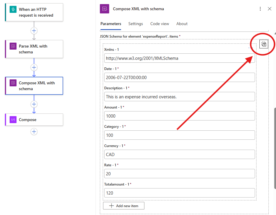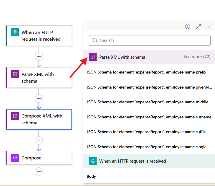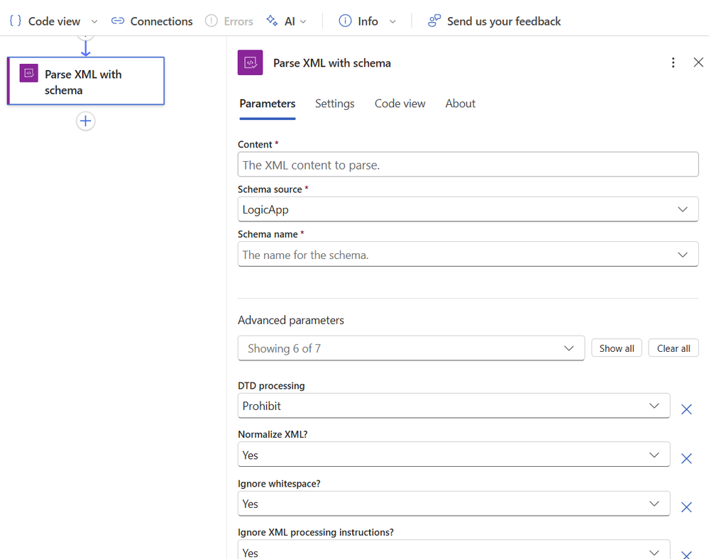 The XML parse with schema allow customers to parse XML data using an XSD file (an XML schema file). XSD files need to be uploaded to the Logic App schemas artifacts or an Integration account. Once they have been uploaded, you need to enter the enter your XML content, the source of the schema and the name of the schema file. The XML content may either be provided in-line or selected from previous operations in the workflow using the token picker.
