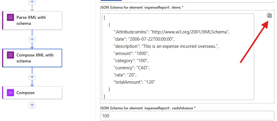 - Switch to array input mode when mapping arrays. By default, the Logic App Designer expects individual array items for XML elements with maxOccurs > 1. If you want to assign an entire array token, use the array input mode icon in the Designer. This avoids unnecessary For Each loops and streamlines your workflow.