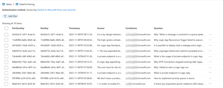 Azure Storage Account: I'm using Storage Table and Blob container in this scenario, the Storage Table maintains the raw data which collected from Microsoft Form and blob stores the Jsonl files which generated by Logic App.