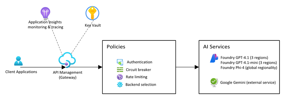 - Unified authentication that enforces consistent authentication for every request, supporting both API key and JWT validation for inbound requests, with managed identity used for backend authentication to AI services.