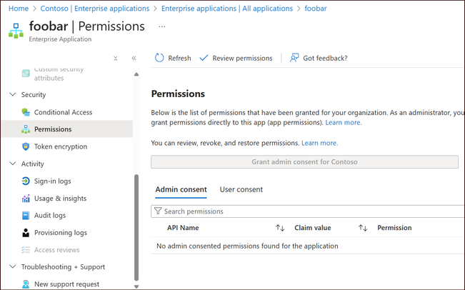 The Grant admin consent button is disabled.
