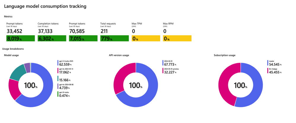 A built-in dashboard in the Azure portal provides an at-a-glance view of token usage trends, model performance across teams, and cost drivers- empowering organizations to make data-driven decisions around AI consumption and policy.