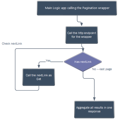 Map the response to the standard pagination format And add the next Link attribute in case this is not the last request Note that I have a variable that hold the wrapper logic app url so I can build the next link |