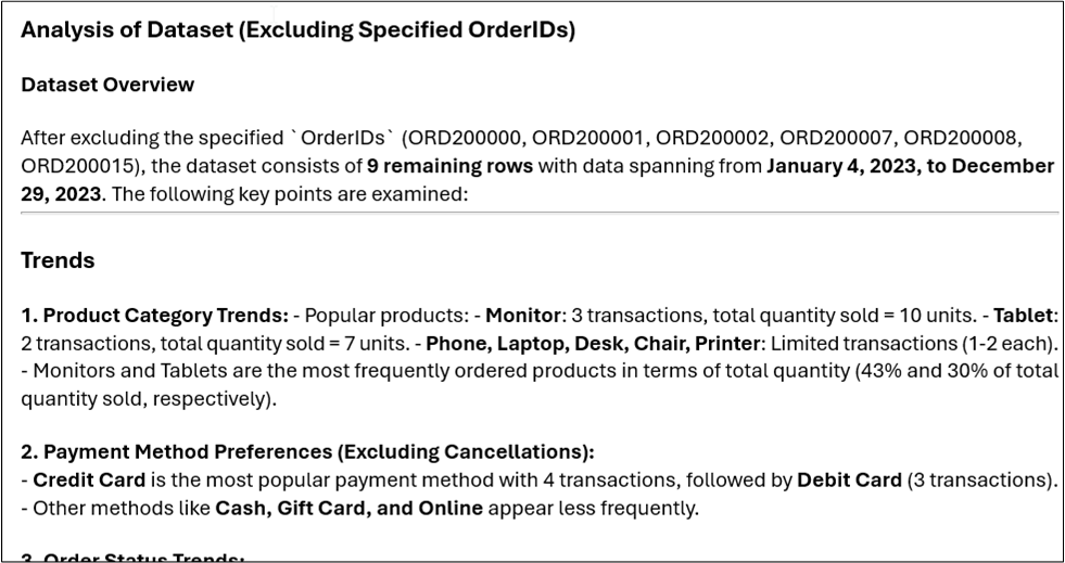 The model’s output is plain text and often includes lightweight markdown structures (headings, lists, separators). To make the analysis readable in email (and safe to embed in the SAP response envelope), the workflow converts the markdown into HTML. The script was generated with copilot. Source code snippet may be found in Part 1. The next figure shows what the formatted analysis looks like when rendered. Not the explicit reference to the excluded OrderIDs and summary of the remaining dataset before listing trend observations.