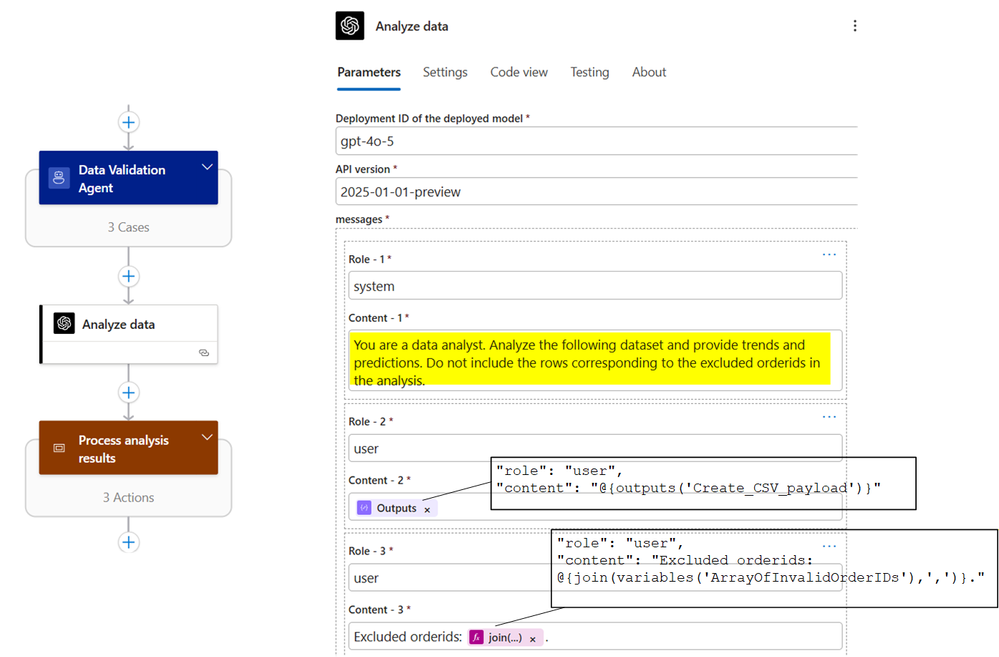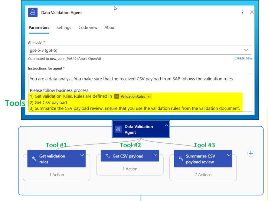 In this solution, the Data Validation Agent runs inside the destination workflow after the inbound SAP payload has been normalized into a single CSV string. The agent is invoked as a single Logic Apps Agent action, configured with an Azure OpenAI deployment and a short set of instructions. Its inputs are deliberately simple at this stage: