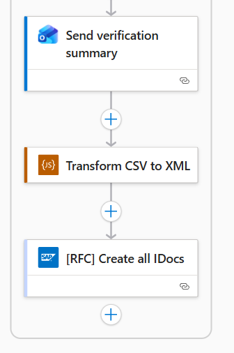 The figure below shows the tail end of the verification summary flow. Once the agent produces the structured validation outputs, the workflow first emails the human-readable summary, then converts the invalid CSV rows into an SAP-friendly XML shape, and finally calls the RFC that creates IDocs from those rows.
