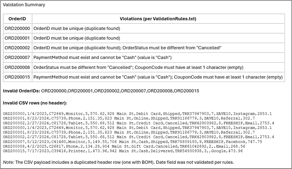 The validation loop is constrained by tools and parameter schemas so its outputs are immediately consumable: an email-friendly validation summary, a machine-friendlyInvalidOrderIdslist, and an invalid-row payload that can be remediated. - A clean separation between validation and analysis.